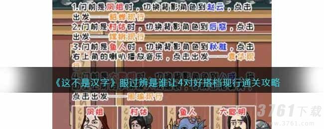 这款游戏名为《这不是汉字》,是在抖音上火爆的一款适合所有年龄层的休闲游戏。其中有一关名为“眼过辨是谁”,需要想办法让四对好搭档合作才能通关。如果还没有通关的小伙伴们,可以看看攻略图文,希望能对大家有帮助。