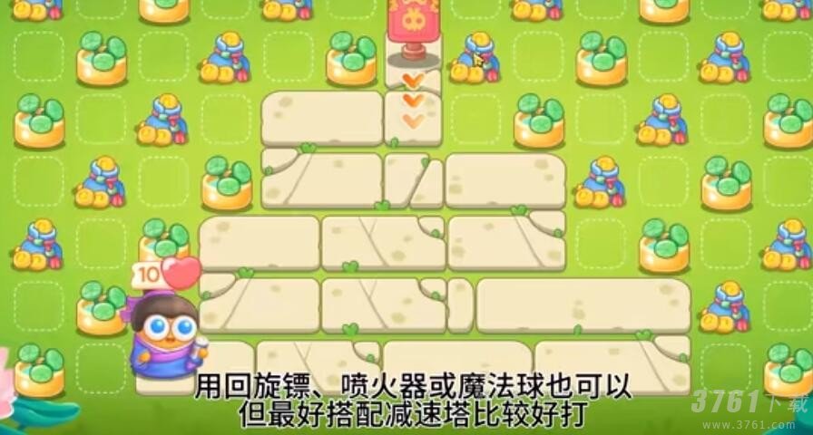 1、用回旋镖、喷火器或魔法球也可以,但最好搭配减速塔比较好打